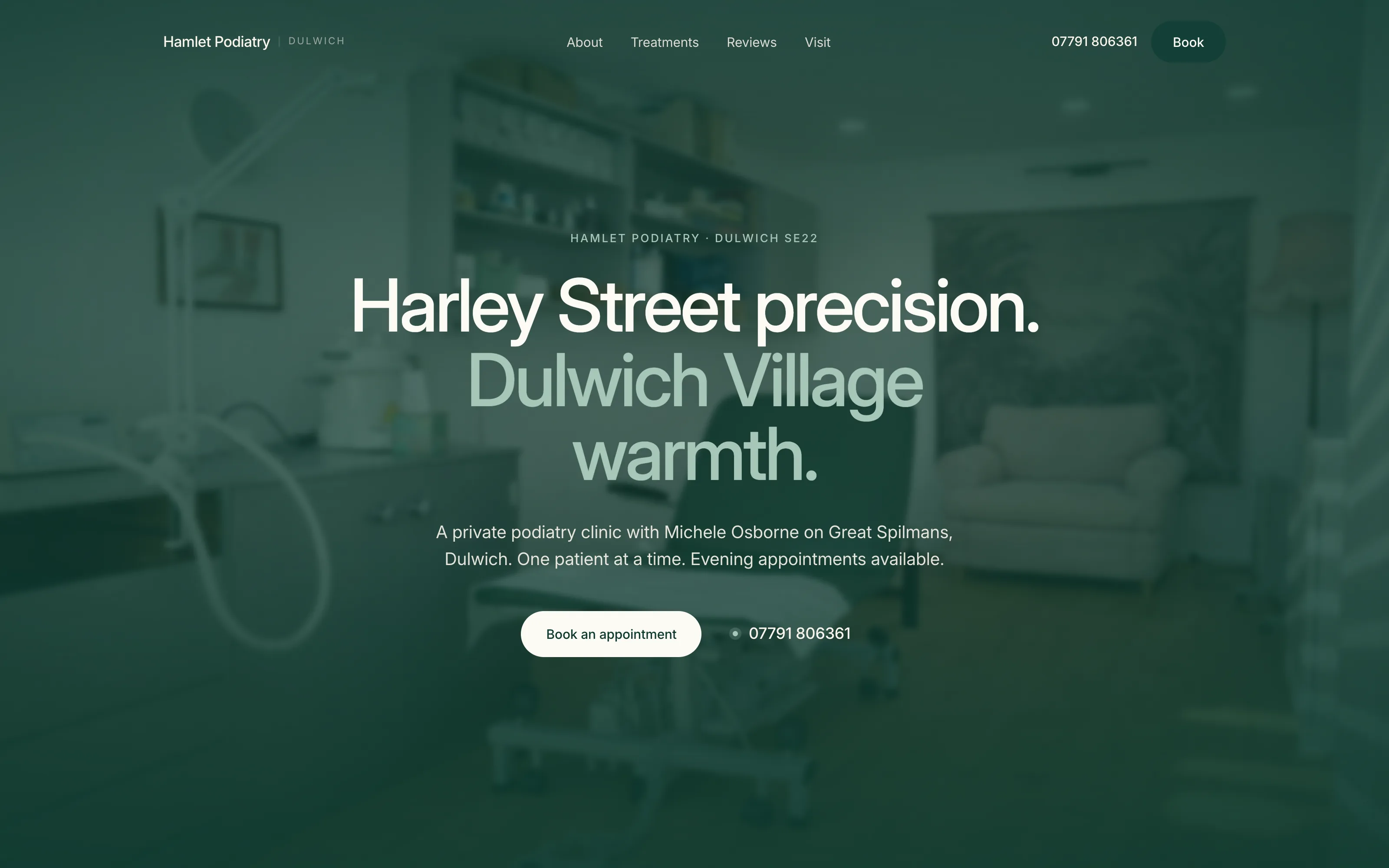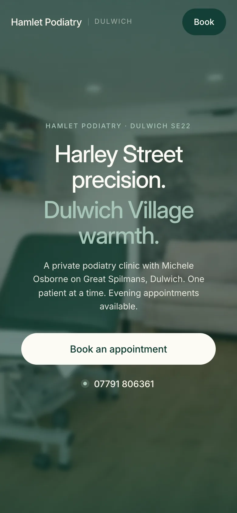 Michele Osborne opened Hamlet Podiatry on Great Spilmans in early 2025. She had trained in the Harley Street Medical Quarter and NHS high-risk clinics — no other sole-practitioner podiatrist in South East London could say the same. On the site, that fact lived in the middle of a paragraph, under an Elementor hero in mint-seafoam green. The Cliniko booking widget didn't load. The footer said 8 Great Spilmans. The booking page said 28.